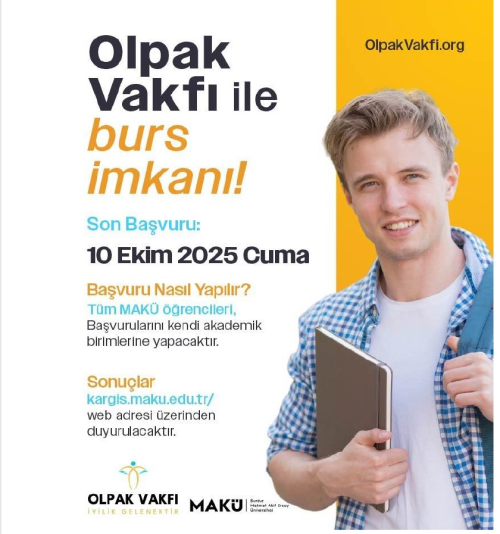Olpak Vakfı bursuna başvuruda bulunmak isteyen öğrencilerimiz 10 Ekim 2025 Saat 16:00' a kadar istenilen belgeleri Yüksekokulumuz Müdür Sekreteri Hüseyin ÖZCAĞAN' a teslim etmeleri gerekmektedir.